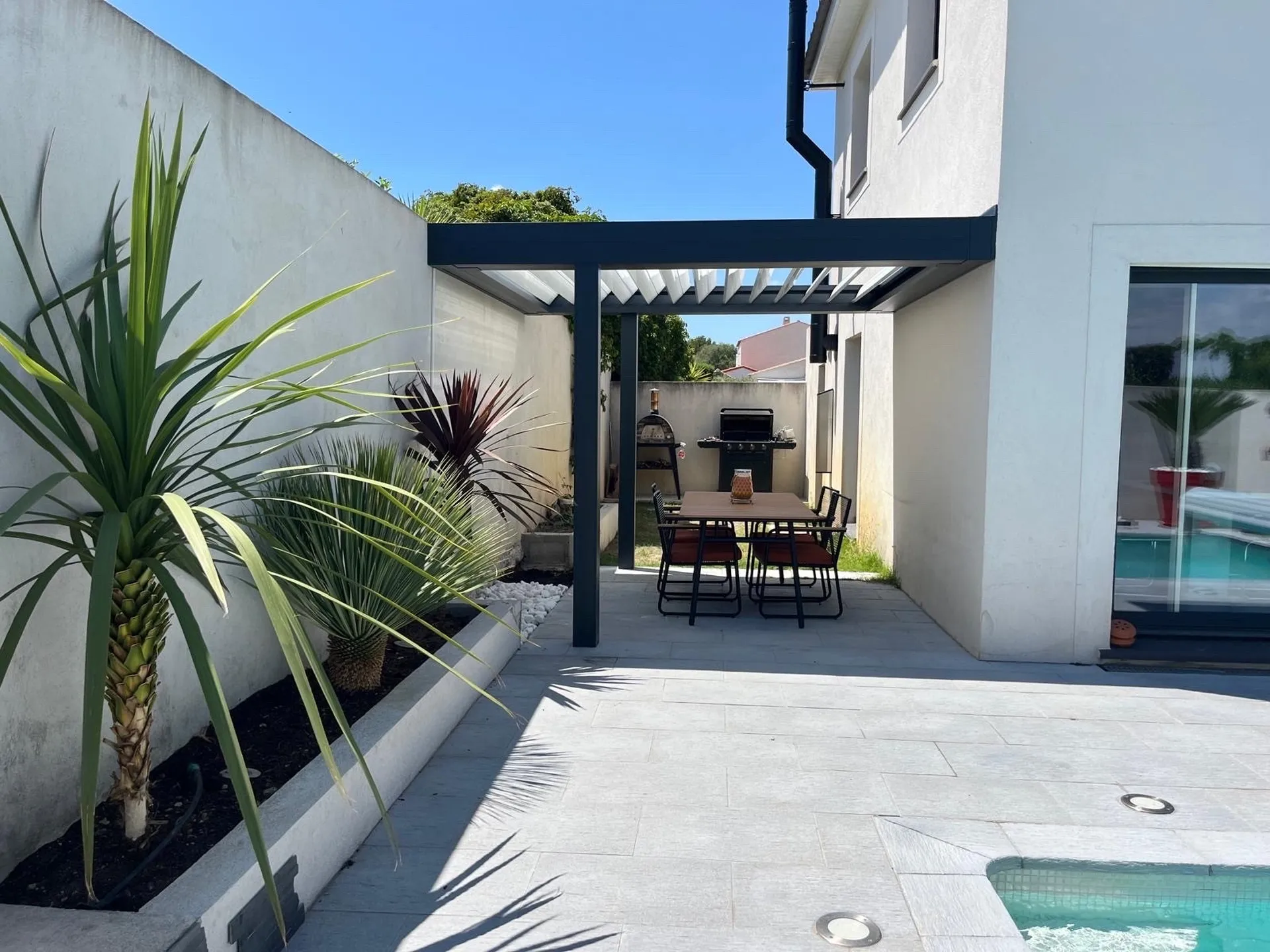 Lames Orientables : Les lames blanches orientables de la pergola permettent de moduler la lumière naturelle selon vos besoins. En ajustant l'angle des lames, il est possible de contrôler l’ensoleillement et la ventilation, offrant un confort inégalé en toutes saisons. Cette fonctionnalité bioclimatique assure une gestion thermique naturelle, réduisant ainsi les besoins en climatisation.